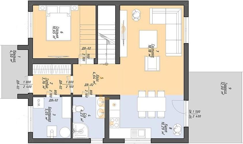 Планировка первого этажа предусматривает просторную гостиную 18,18 кв.м. совмещенную с кухней 10,29 кв.м., спальню, санузел, холл, тамбур и отдельное помещение под бойлерную. На втором этаже расположены 3 спальни, санузел и 2 балкона.