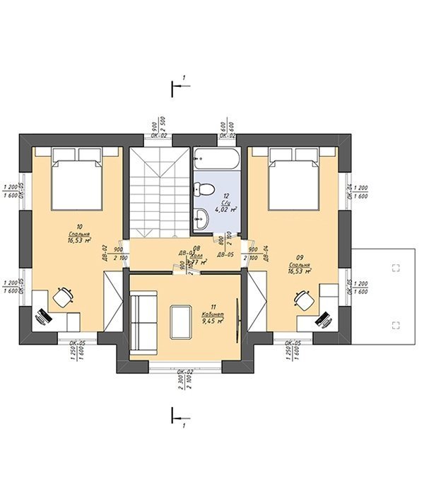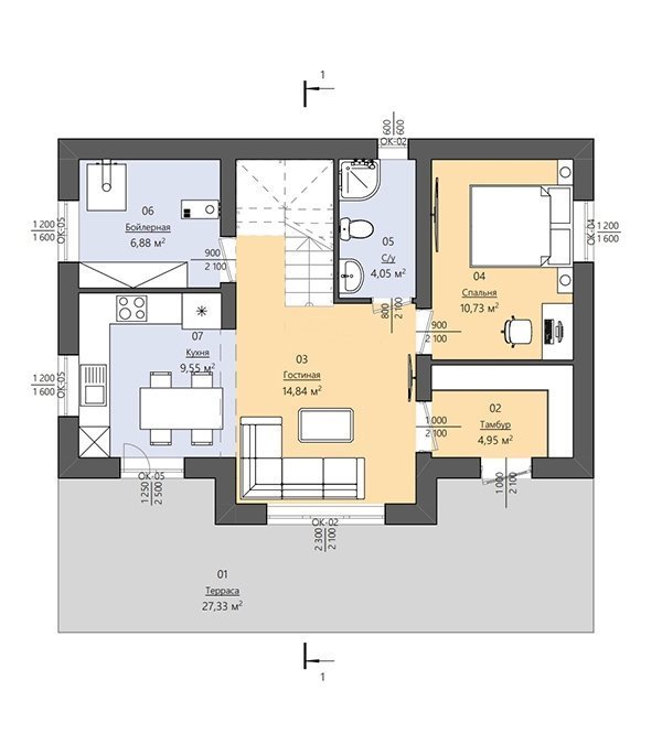 Планировка первого этажа предусматривает гостиную 14,84 квадратных метра совмещенную с кухней 9,55 квадратных метров, спальню, санузел, тамбур и отдельное помещение под бойлерную. На втором этаже располагаются 2 спальни, кабинет, санузел и холл.